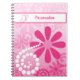 Personalize by adding your name to this cute, girly pink Spiral Notebook with an image of bright pink retro flowers and swirling strings of beads. A pretty little butterfly drawing is placed next to the customizable name box. Perfect for a teenage girl who loves accessories to be pretty in pink, or a great back to school gift.