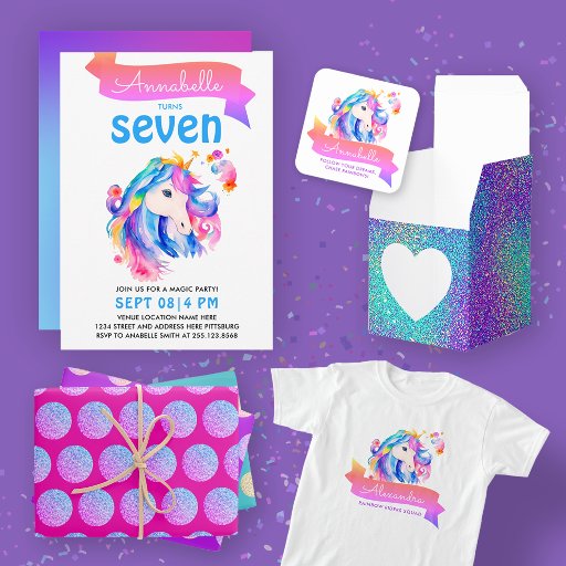 You can apply the design of your Cute Girly Unicorn Horse Orange Red Glitter Stars Invitation to other items for a party such as stickers. The same goes for all of our digital products - any digital product/ design you purchase can also be used on any Zazzle product.