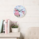 This magical and enchanting wall clock features a fairy garden fairy tale theme. Two cute pixie fairies are fluttering on either side of the clock. One has soft blue hair and the other has pretty pink hair. The one with blue hair is flying above a cute little house with tiny mushrooms and a flower for a roof.