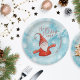 Create cute personalized Christmas party tableware with a Happy Holidays saying and a cheerful gnome in red on a snowy background. Type your Family name and year using the template text to customize it with ease.