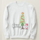 Cute holiday sweatshirt features Santa gnome and whimsical tree with modern script "Seasons Greetings" text