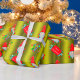 A very cute green Christmas wrap, featuring a pattern of little Christmas elves (or gnomes) in red hats on a chartreuse green background. They're surrounded by colorful, striped Christmas stockings, candy canes and 'Merry Christmas' signs.