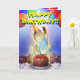 A festive, colourful and vibrant birthday card with a cute shining gold furred kitty singing your happy birthday wishes.