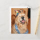 This postcard features a photograph of a cute golden retriever dog dressed in a party hat and lei. His eyes are closed and he's thinking of what he might get for his birthday! Text on back reads, "May All Your Birthday Wishes Come True," but this can be changed or deleted.