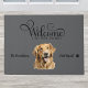 This Golden Retriever dog doormat is the perfect gift for any dog lover. This design is complete with the words "Welcome to our home", a place to add your name and your dog's name, and an adorably cute Golden Retriever watercolor graphic. Enjoy!