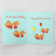 Are you looking for a cute birthday card for a kid? Perhaps this all around designed birthday card is the one you like to buy. The designs are digitally drawn vector illustrations and showing goldfish in a hurry to wish the birthday kid a happy birthday. The text on the front and the inside text are template objects and can be changed easily into any other text. It is also possible to add moretext or to delete text. You even can change the size of the text, the color of the text or to chose a different font type. It is also possible to change the inside background colors and / or to remove the inside right image.