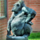 A cute gorilla looking out of a window.