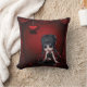 Gorgeously Gothic romance throw pillow (made in the USA) with a print of a cute little goth girl sitting in a beautiful red and black gothic room with lovely damask drapes and an elegant romantic ornate hanging heart. She is sat in a different pose on the back of the pillow. A stylish and original gift - perfect for teenage girls and goths! From Gorgeously Gothic Designs.