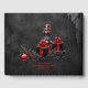 Cute Gothic Christmas Elf. At the center of this magical setting stands a pointy-eared elf, her eyes sparkling in the light of the full moon like stars on a clear night. Her black and red dress gently sways around her slender frame, giving her an aura of elegance and mystery. The surroundings are adorned with ornate black and red Christmas decorations that seem like forgotten relics from another time. They frame the scene, giving it a gothic festivity that is both enchanting and eerie.