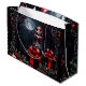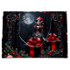 Cute Gothic Christmas Elf. At the center of this magical setting stands a pointy-eared elf, her eyes sparkling in the light of the full moon like stars on a clear night. Her black and red dress gently sways around her slender frame, giving her an aura of elegance and mystery. The surroundings are adorned with ornate black and red Christmas decorations that seem like forgotten relics from another time. They frame the scene, giving it a gothic festivity that is both enchanting and eerie.