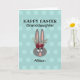 Make her day with this Cute Granddaughter Easter Bunny Rabbit Name Card. It is modern designed with a customizable pastel teal background and an adorable grey funny bunny with tall ears and burgundy flowers. The text is "Happy Easter granddaughter" and her name on the front of card. The background has lighter shade teal polka dot pattern. The inside card has a simple customizable greeting and your signature "from" name. Click the personalize template option and follow the prompts.