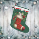 This Holiday stocking has an image of an adorable little gray mouse peeking out of an ornate red stocking. The image is surrounded by holly, red berries, and poinsettia blooms, and is placed on a Christmas green background. A white scalloped edge design bordered in red holds your customized name at the top. The back of the stocking is identical to the front.