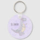 A key chain with a cute illustration featuring a grayish purple dinosaur.