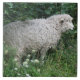 This awesome tile features a photograph of a cute fluffy sheep. The sheep is surrounded by wild flowers and long grass and is greedily eating some leaves. It has a thick white coat of wool and a cute black nose.