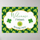 A birthday welcome poster with a cute repeating pattern with olive green clovers on a dark green background. A fancy vintage frame layered over top with your text inside. Frame has a faux gold foil border.