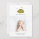 Cute green photo birth announcement template card featuring an adorable illustration of green baby dinosaur sleeping under the yellow stars on the front. There are 2 pictures of your newborn that can be added on this card (front and back), and a space on the back for your personal message. Perfect card to announce the arrival of your new baby with his/her birth stats. Great for both baby boy and girl. Perfect for all seasons!