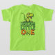 Playful green cartoon dinosaur perched on bold 'Dream Little One' lettering, ideal for baby nursery decor, kids’ birthday invitations, T-shirts, posters and whimsical children's room art.