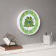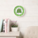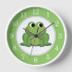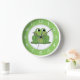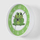 Cute green frog clock designed with an adorable green frog in the center with green around the outer edge and the numbers in white. It's perfect for anyone who loves cute smiling frogs and the color green.