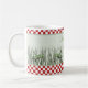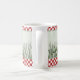 This Cute Green Grasshoppers Picnic Kids Coffee Mug features top and bottom red and white checkered borders, capturing the essence of a charming picnic scene, with cute green grasshoppers hidden in the tall grass and ladybugs crawling about. Personalize with a name.