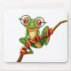 This adorable design features a small green tree frog holding on to a thin branch. The tiny frog is looking forward with it's head tilted slightly to one side giving it a curious look. All four of the frog's feet are wrapped around a thin branch that moves from the bottom of the design up to the right side of the pattern. Reading glasses sit on the frogs nose which gives the pattern a playful look and intelligent feel. This unique design is a cute example of this wonderful little rain forest creature.