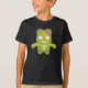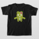 Cute cartoon illustration of a green zombie panda bear character who is holding his arms up high. The panda has a creepy face expression and some of his pink brain is visible. On the chest of the panda there is an image of a skull too.