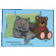 A sweet gray cat lounges against a soft green pillow, snuggled beside a classic teddy bear and wearing an irresistibly innocent expression. Paired with the playful caption “If I keep looking cute… they will hopefully blame the dog,” this illustration captures the mischievous heart of every cat lover.