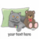 A sweet gray cat lounges against a soft green pillow, snuggled beside a classic teddy bear, bright blue backdrop and wearing an irresistibly innocent expression, this illustration captures the mischievous heart of every cat lover.