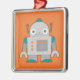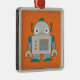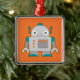 A cute grey and teal box shaped robot with orange buttons, clamp hands, antenna ears and big eyes. The Robot stands on a plain orange background.