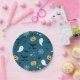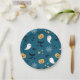 Cute paper plate featuring whimsical Halloween ghosts, pumpkins, spiderwebs and bats against a dark blue backdrop.