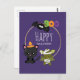 A happy halloween postcard with a black flying bat, a green mummy bat wearing white bandages and a cute black cat with an orange witches hat. Boo written in fun colorful letters.