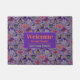 This Halloween doormat has a cute knitted sweater pattern is based off of the theme of classic Fair Isle knitted designs. The pattern is of purple and green circles and diamond stripes. Each shape has a different cute Halloween motifs in it. You have black cat with a moon, Frankenstein’s head, happy jack o’ lantern pumpkin, skull with red eye raven, witches hat with feet, grave yard with ghosts, vampire lips/teeth with bats, and a picketed fence yard with a fall tree the moon with a bat. In-between the designs are candy corn, wrapped candy and a diamond design. On top is an area that says Welcome to our home and the family. Personalize this with your own greeting and family name.