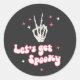 This Halloween sticker features the text Let's get spooky in a trendy retro typography and a skeleton hand giving a peace sign and starbursts in pink orange and white. Additional party favors, accessories and invitations with this same design theme are available in our zazzle store, for additional customization send me a message