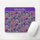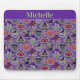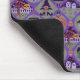 This cute Halloween mouse pad has a theme of classic Fair Isle knitted designs. The pattern is of purple and green circles and diamond stripes. Each shape has a different cute Halloween motifs in it. You have black cat with a moon, Frankenstein’s head, happy jack o’ lantern pumpkin, skull with red eye raven, witches hat with feet, grave yard with ghosts, vampire lips/teeth with bats, and a picketed fence yard with a fall tree the moon with a bat. In-between the designs are candy corn, wrapped candy and a diamond design. At the top is a bar in matching colors with a name. Personalize this with your own name.