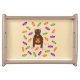 This awesome serving tray features a graphic image of a cute little brown rat with pink ears tail and feet. The rat is holding an orange pumpkin between its paws. There is a collection of green, purple and orange candy sweets surrounding the little rat. This design is perfect for any rat lover or owner this Halloween.