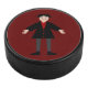 This awesome hockey puck features a digital art image of a creepy but cute Halloween Vampire. The vampire has spiky black hair, a red shirt and black jacket with blood red heart shaped buttons on it. He has a creepy smile and long white fangs. He also has yellow fingernails, purple socks and black shoes with gold buckles on them. His arms are open welcoming you for an evil embrace.