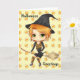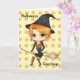 Cute Halloween chibi and her black kitty are flying on a broom against a candy corn background on a greeting card for your own text. Customizable so you can change the text if desired.
