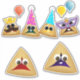 Happy Kawaii hamentashen cookies dressed up for Purim with party hats and masks.