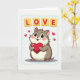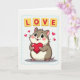 This greeting card features a cute cartoon hamster holding a bright red heart close to its chest 💘. The hamster has light brown fur, a creamy white belly, and round black eyes with tiny highlights that make it look friendly and excited. Its cheeks are pink, and its small smile gives the whole scene a sweet, caring feel. Above the hamster, the word “LOVE” appears on yellow square tiles with red letters, like a classic word game, and the tiles sit near the top of the card. The background looks like a torn piece of pale blue graph paper with a faint grid and uneven edges. Small red hearts float around the hamster, adding extra warmth and romance ❤️. It’s a simple, happy design that’s great for someone you care about 😘