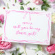 Ask your little flower girl in the sweetest way possible with this charming and customizable "Will You Be My Flower Girl?" card. Featuring a simple yet elegant hot pink design with delicate floral accents and a bow, this card is perfect for making her feel special. Personalize it with her name for a personal touch. Ideal for brides looking to add a heartfelt moment to their wedding preparations. Let this adorable card be a memorable part of your wedding journey!