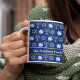 Beautiful Hanukkah mug in pretty blue with a cool pattern of Judaism star, dreidel for fun Chanukah games, and the Jewish menorah for a holiday dinner or gathering with your synagogue. Customize with your family name.
