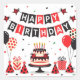Cute happy birthday ladybug theme. Red, black and white design with balloons, paper hats, gift boxes and cake.
