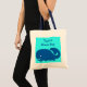 Cute Blue Whale Beach Bag Custom Name Tote bag. Features a cute cartoon blue whale with his tail curved up and a smile on his face, with his bottom on the waves. On a aqua, sea blue background. Customize with the name, change wording or delete to leave plain. You can choose your handle color on some bags.