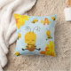Add a cute touch to your little one's bedroom or nursery with this adorable bumble bee throw pillow. Pillow features six happy bees, one with honey, and the others buzzing around. There are also yellow and orange flowers and a soft blue background. In the corner there's a place for your young kid's first name and monogram initial.