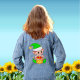 Modern happy and cute Christmas elf holding a gift box Jacket. Text can be personalized.