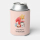 Can cooler with an adorable image featuring a smiling cow, with a gold star balloon and some cake and a present.