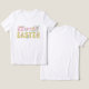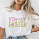 Personalized, trendy and cute hand lettered typography Happy Easter T-shirt with hand painted bunny, chick, flowers, decorated eggs and carrots in vibrant spring colors. Original art by Leslie Larson.