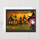 Wish everyone a happy Halloween with this cute postcard featuring an anime witch and a haunted house and pumpkin design!