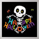 This design features a cute skeleton with two bats in the background. The text "Happy Halloween!" is written in popular colorful modern text.