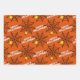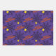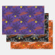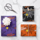 A cute set of three coordinating Happy Halloween gift wrapping sheets. The design features spiders and webs on black, purple, and orange backgrounds, with Happy Halloween text.