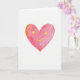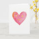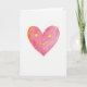 This greeting card shows a hand-drawn pink heart centered on a bright white background. The heart is filled with visible crayon strokes, giving it a warm, handmade look. It has two round yellow eyes and a simple curved yellow smile that feels cheerful and friendly. Near the upper left side, the pink blends into a soft orange area, as if another layer of color was added by hand. A red outline traces the edge of the heart, slightly uneven in a charming way. There is no printed text, so the smiling heart speaks for itself. The card feels kind and full of care, making it a sweet choice for romance, affection, or a close friendship ❤️💌🍫.